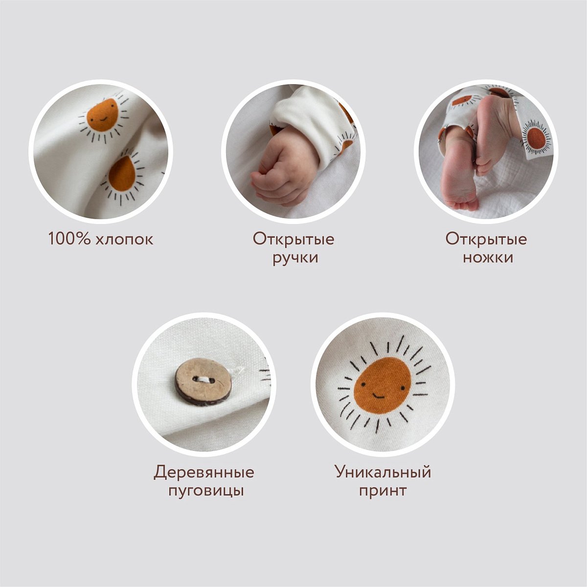 Трикотажный слип с открыми ручками и ножками на пуговицах из натуральной гипоаллргенной ткани, 100% хлопок.Можно носить самостоятельно или в качестве поддевы под верхнюю одежду, а уникальный милый принт дополнит образ в любую погоду.