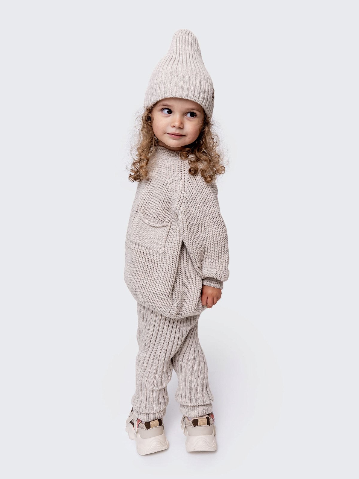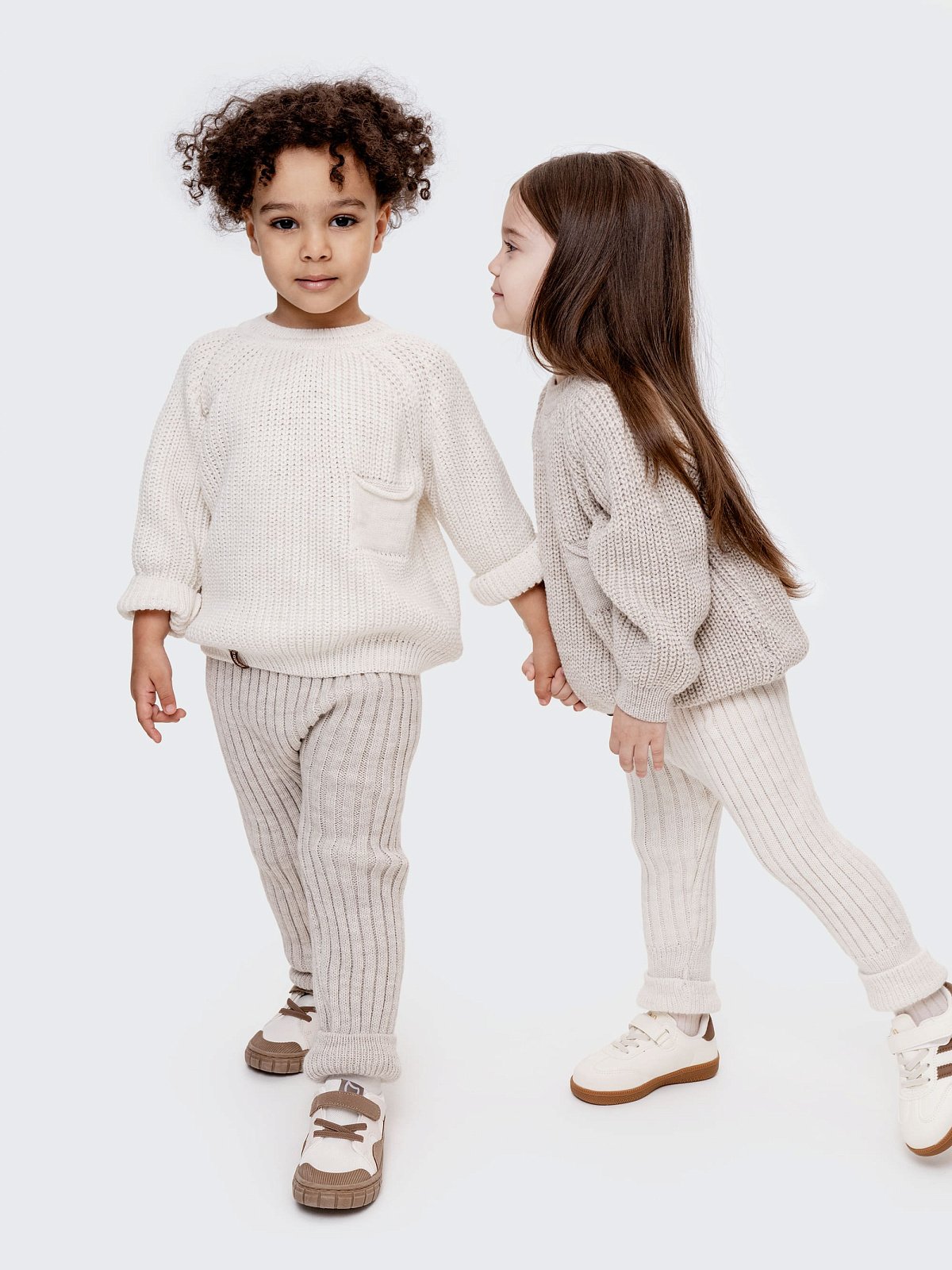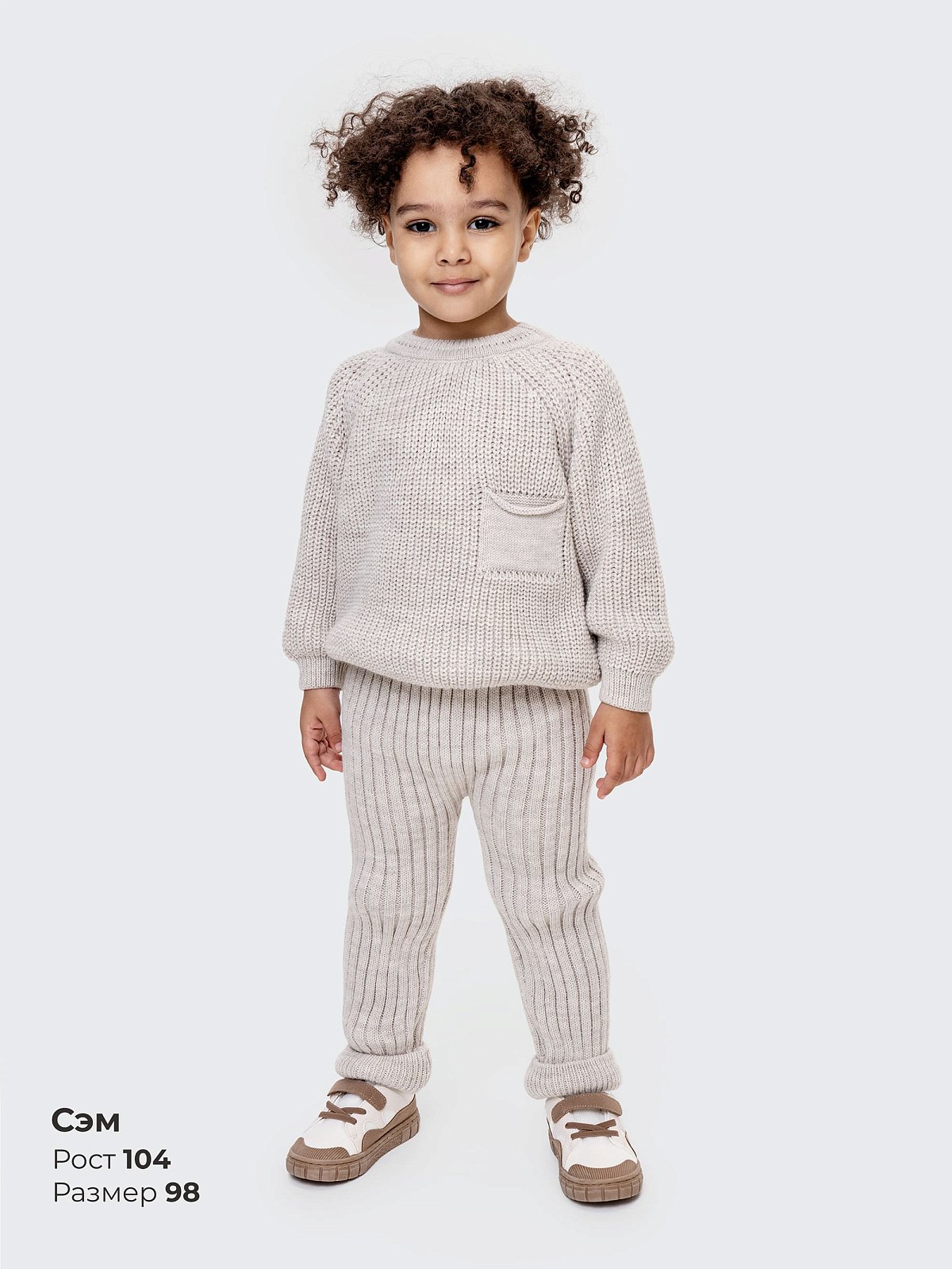 Свитер «Твист» отлично сочетается с вязаными брюками и шапкой из этой же коллекции — создайте стильный и тёплый комплект для вашего малыша!"