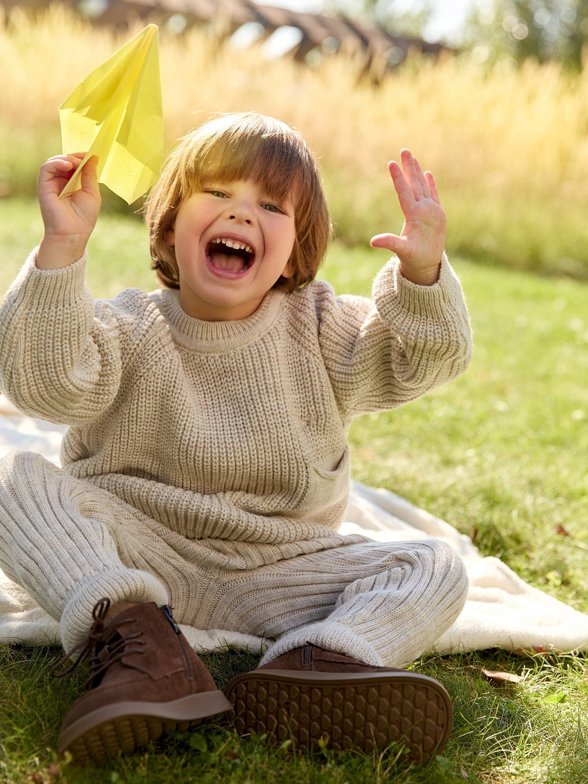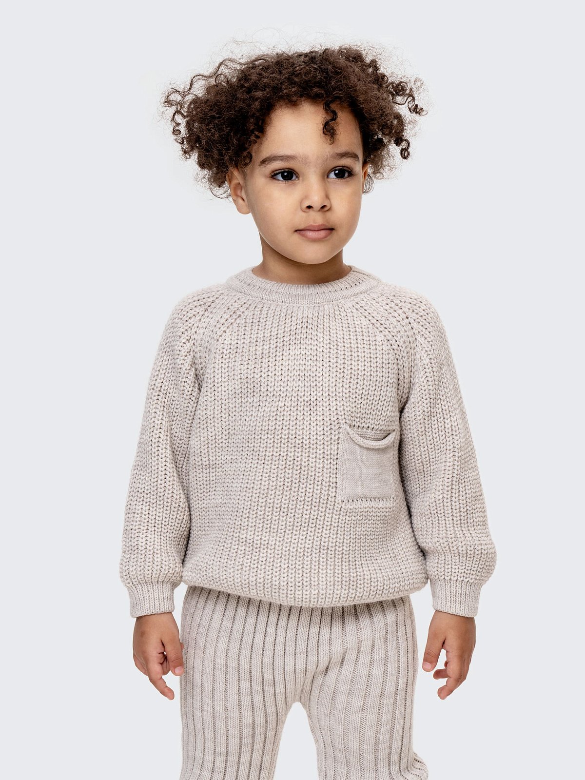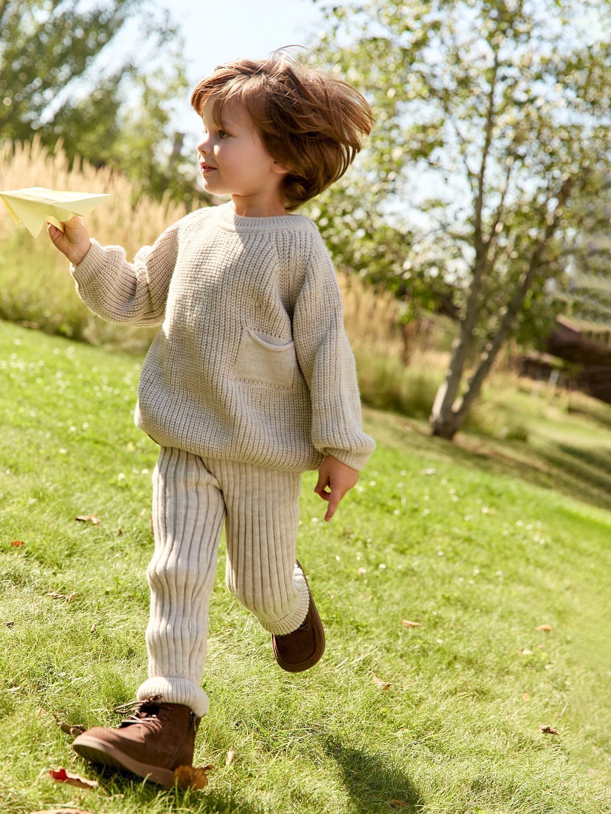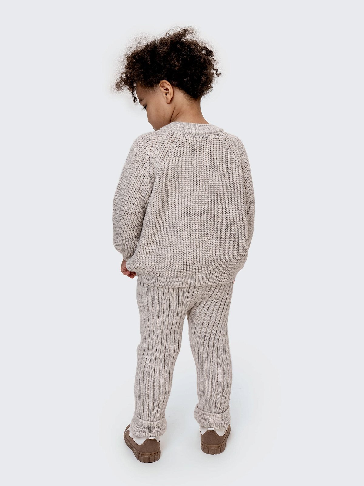 Свитер «Твист» отлично сочетается с вязаными брюками и шапкой из этой же коллекции — создайте стильный и тёплый комплект для вашего малыша!"