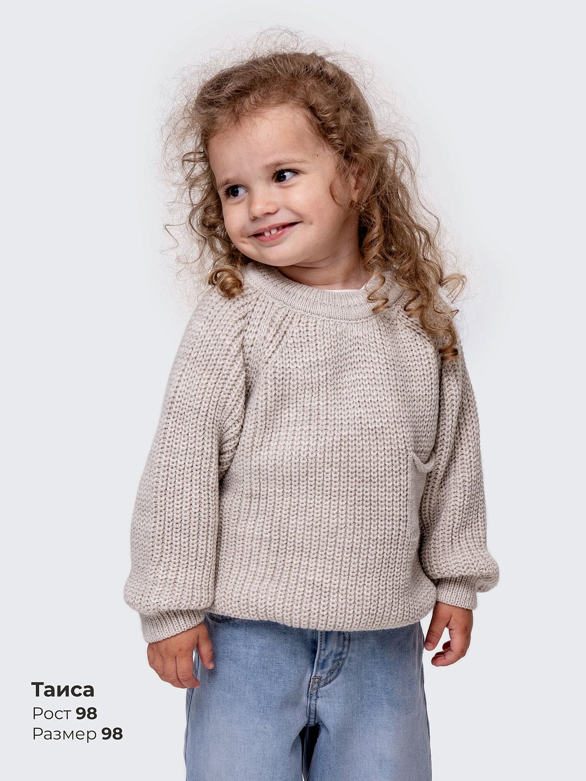 Модель представлена в трёх универсальных оттенках: бежевый, молочный и какао — они подойдут как девочкам, так и мальчикам. Фактурная вязка придаёт изделию особый шарм, а свободный крой не сковывает движений, что особенно важно для активных детей.
