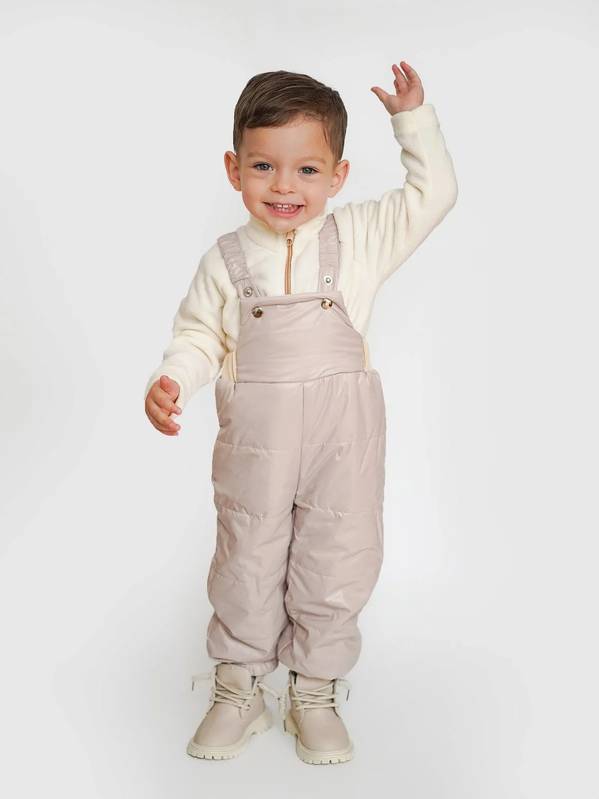 Полукомбинезон имеет подтяжки с резинкой на заклепках, которые надежно фиксируют брюки, но не сковывают движение активного малыша.