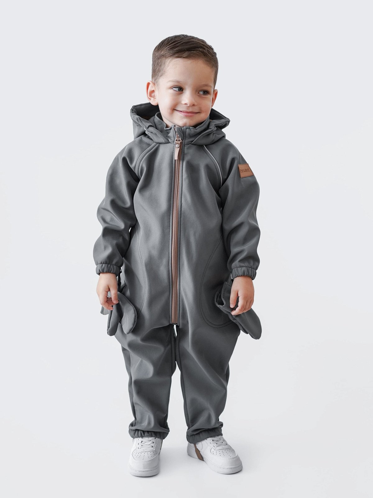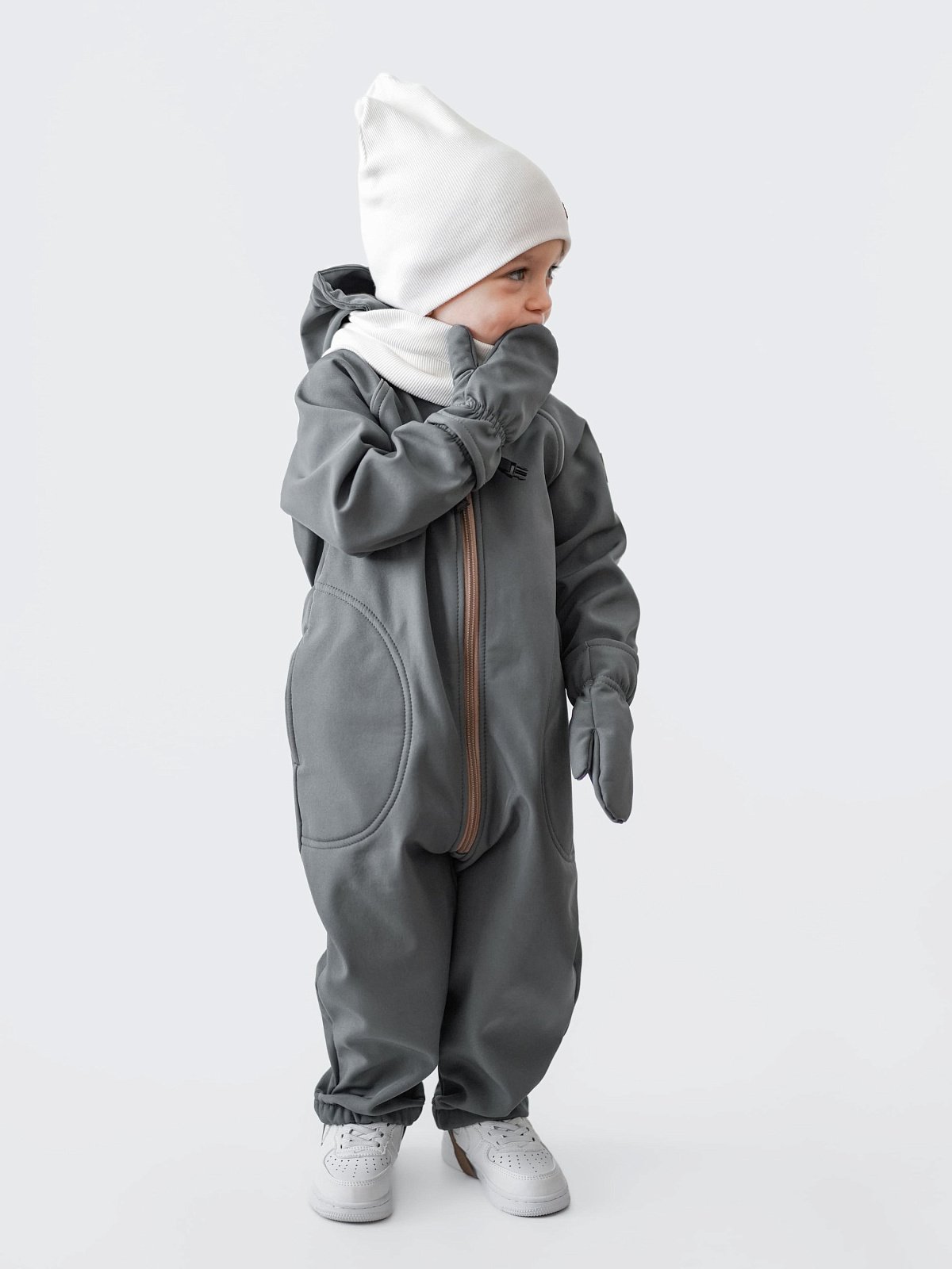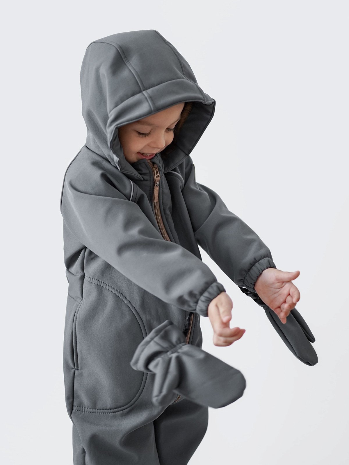 Комбинезон из софтшелла New — практичная одежда для детей от 1 до 10 лет. Изготовлен из многослойного софтшелла с флисовой подкладкой, он защищает от ветра, дождя и холода в диапазоне температур от +5°C до +20°C. Удобные подтяжки, штрипки и варежки, крепящиеся к рукавам, делают его комфортным для повседневного использования.