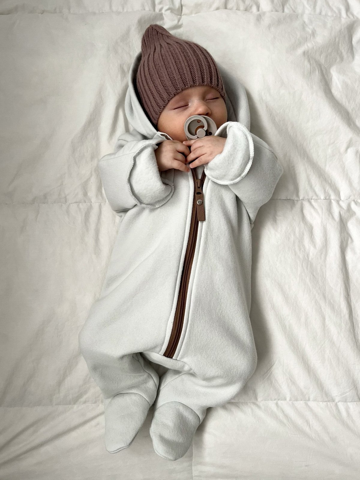 Комбинезон для новорожденных — уютная и практичная одежда для малышей от 1 до 6 месяцев. Изготовлен из мягкого футера с начесом, он сохраняет тепло и обеспечивает комфорт при температуре от +15°C. Закрытые ножки и кармашки-закрывашки на рукавах защищают чувствительную кожу, а капюшон с хлопковой подкладкой защищает голову от ветра.Материал: футер-трикотаж (70% хлопок, 30% эластан), подкладка капюшона — 100% хлопок.