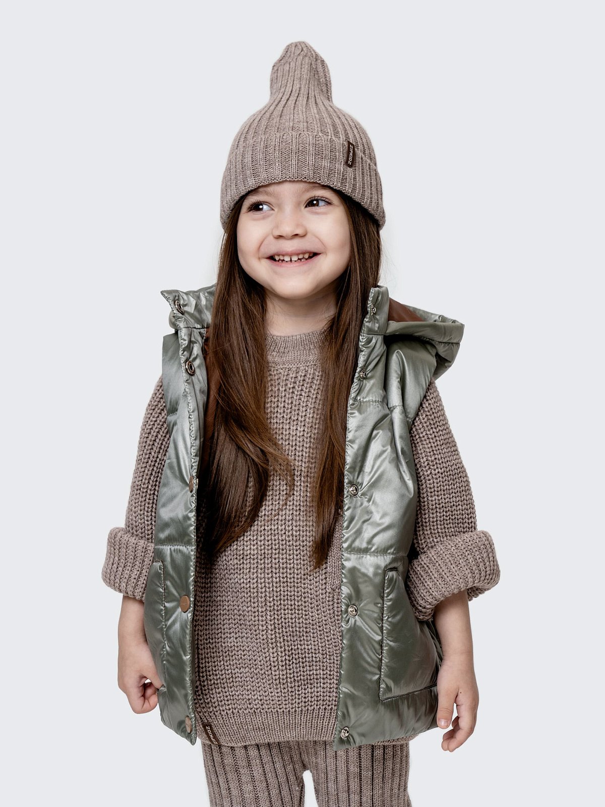 Модель выполнена в спокойных, универсальных оттенках — бежевый, молочный, какао. Такая цветовая палитра подойдёт как девочкам, так и мальчикам, легко сочетается с верхней одеждой и другими элементами гардероба.
